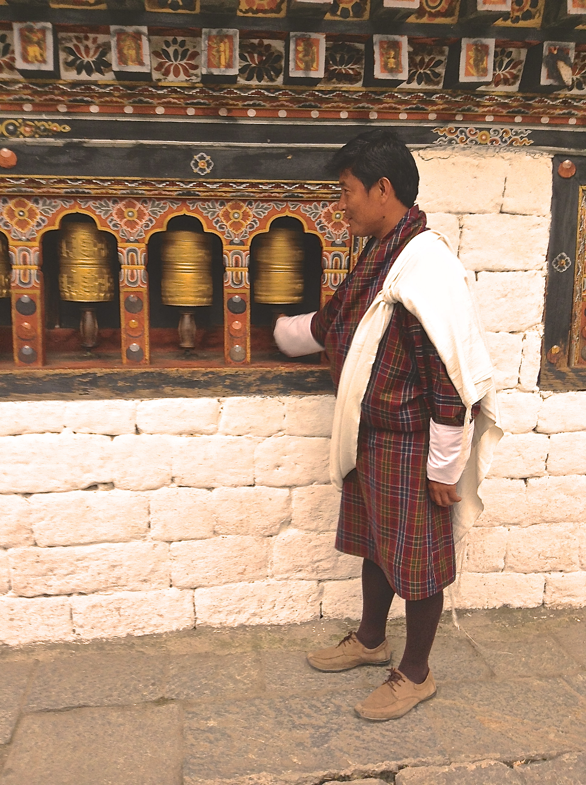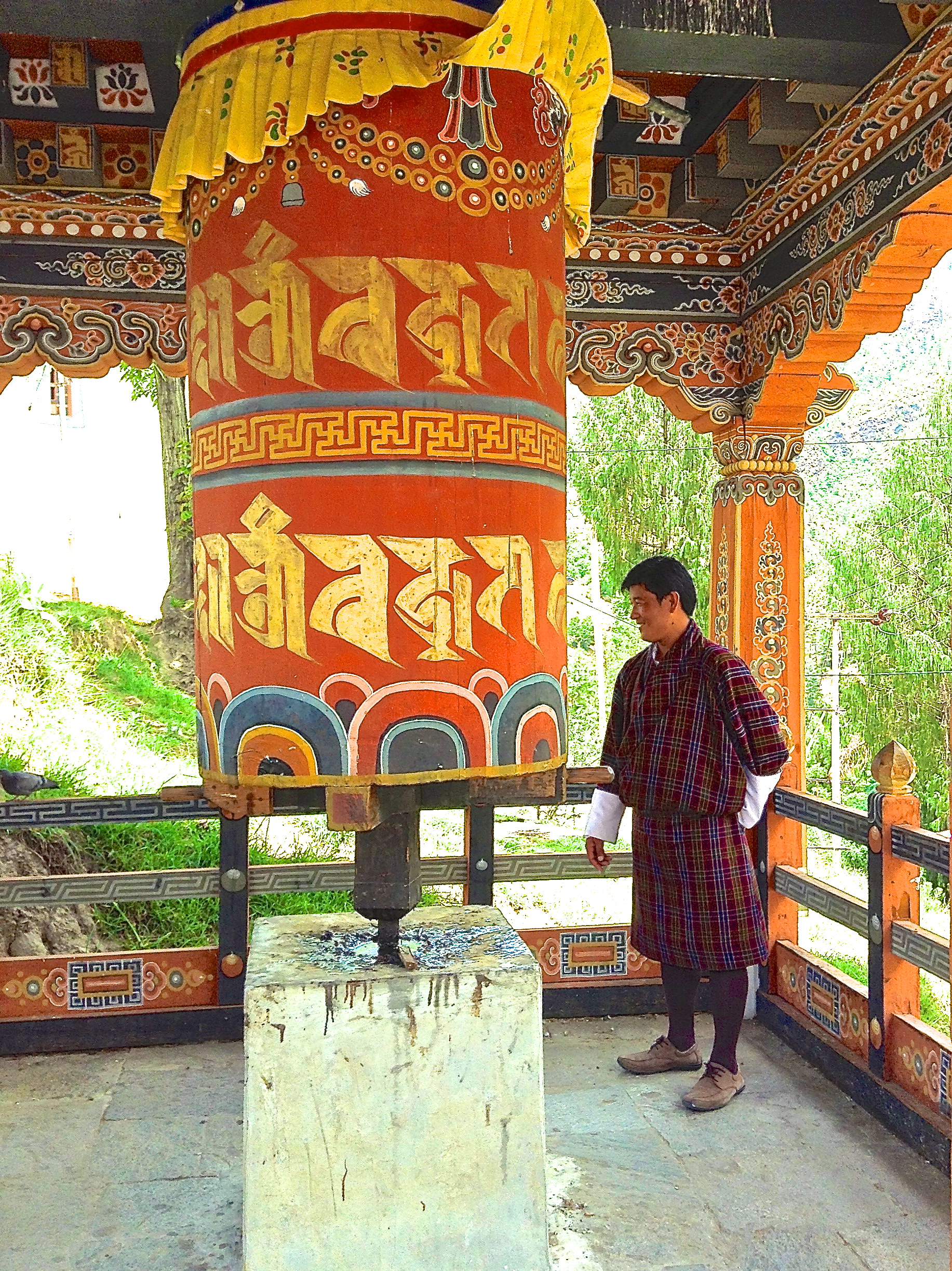 Prayer wheels are usually found around temples and monasteries, attached to the walls so that people can spin them when entering or leaving the temple or monastery. You can also find them built at water sources where the water running makes the wheel turning thus producing a continuous jingle sound which can be heard at far distance.