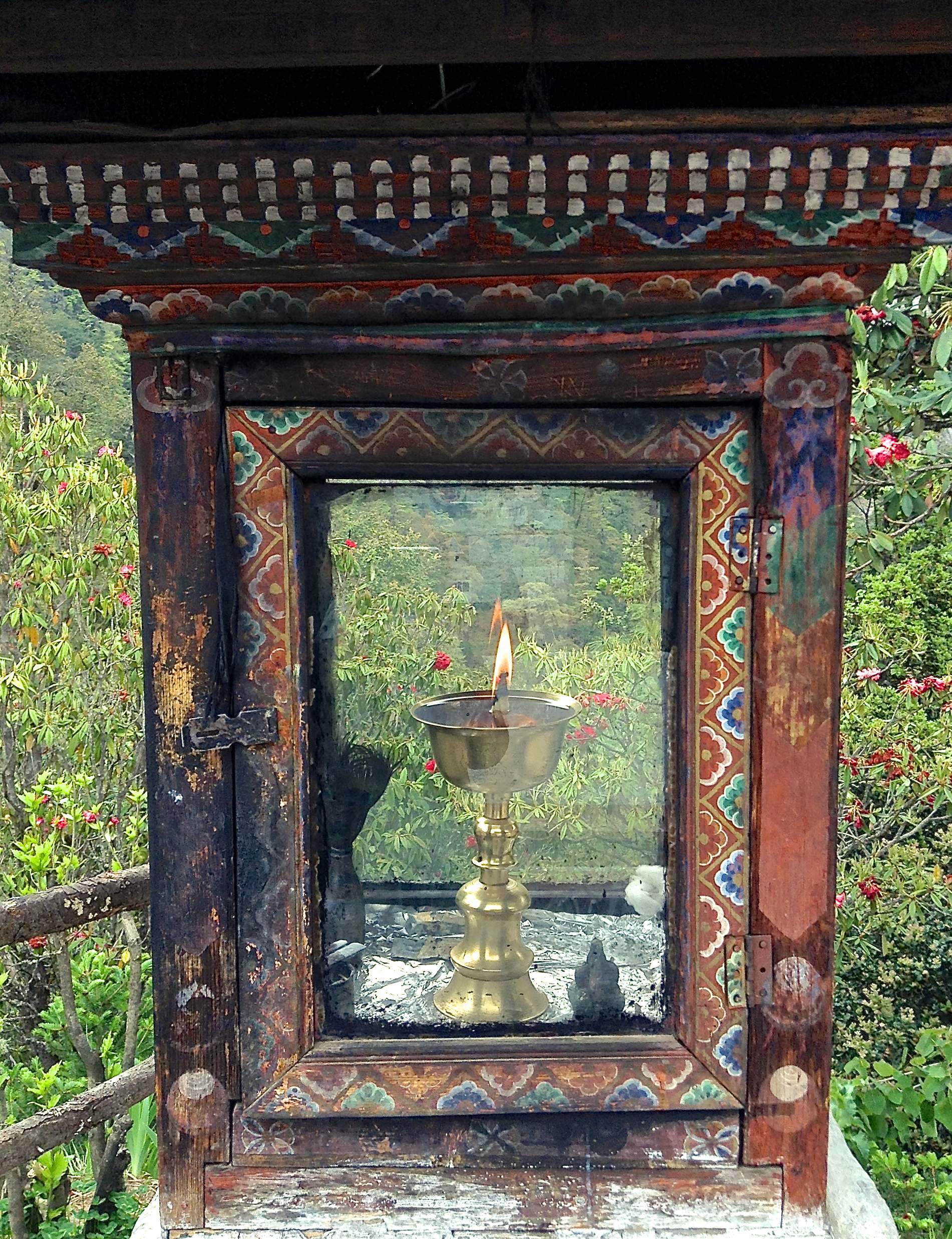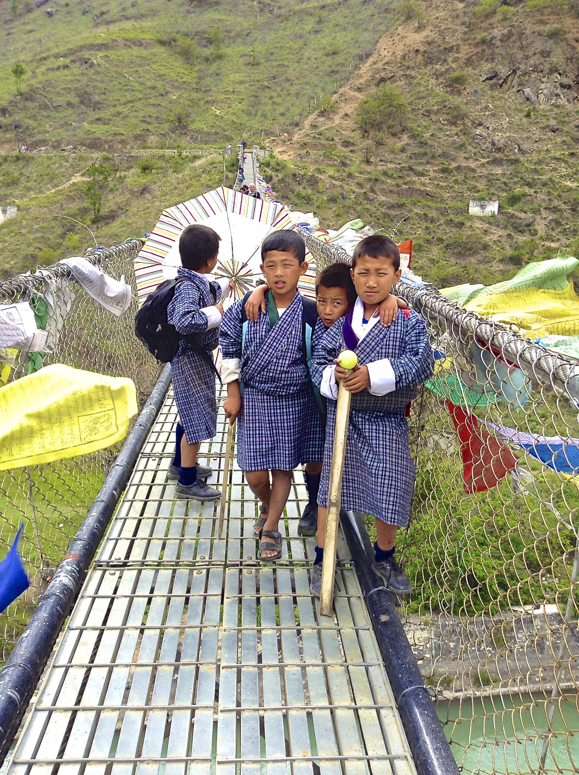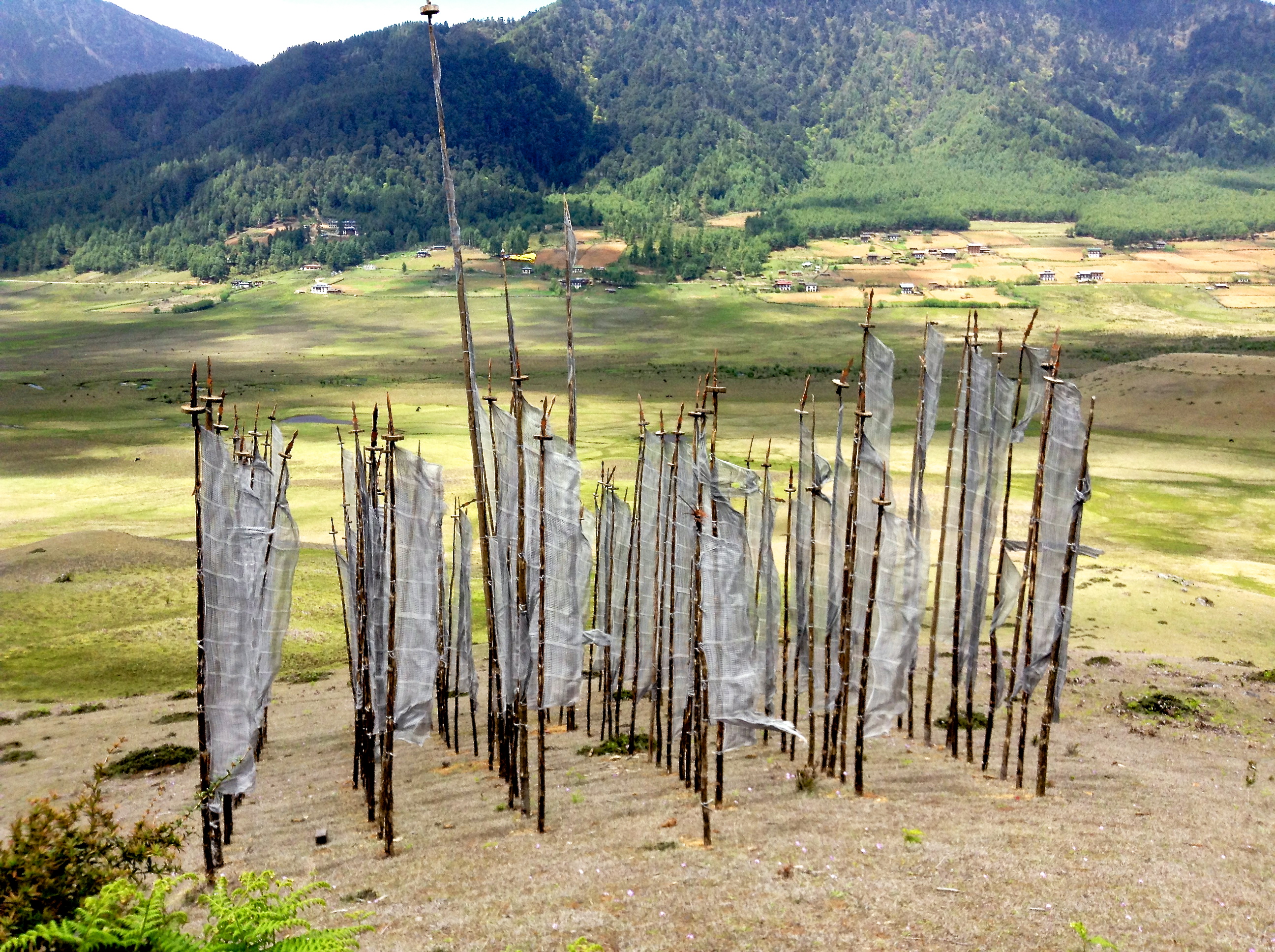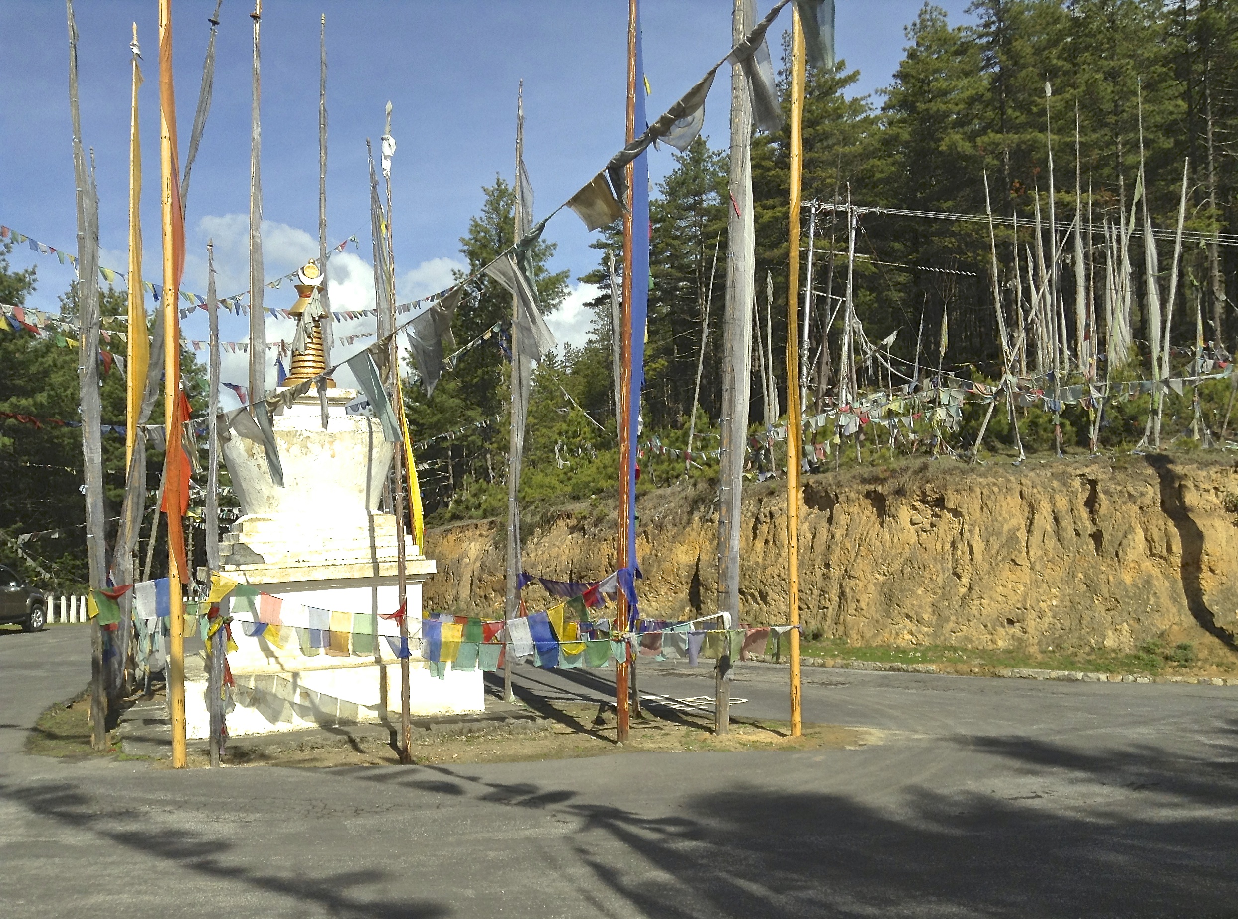 Bhutan landscape is awash with prayer flags: horizontal flags known as “lung ta” (wind horse) and vertical flags known as “Dhar Shing” referring to prayer flag poles. Prayer flags must be put up on a particular auspicious day in order to invoke good luck and increase life force. They come in set of five colors: white, yellow, red, green and blue representing the 5 elements: earth, water, fire, air and space.